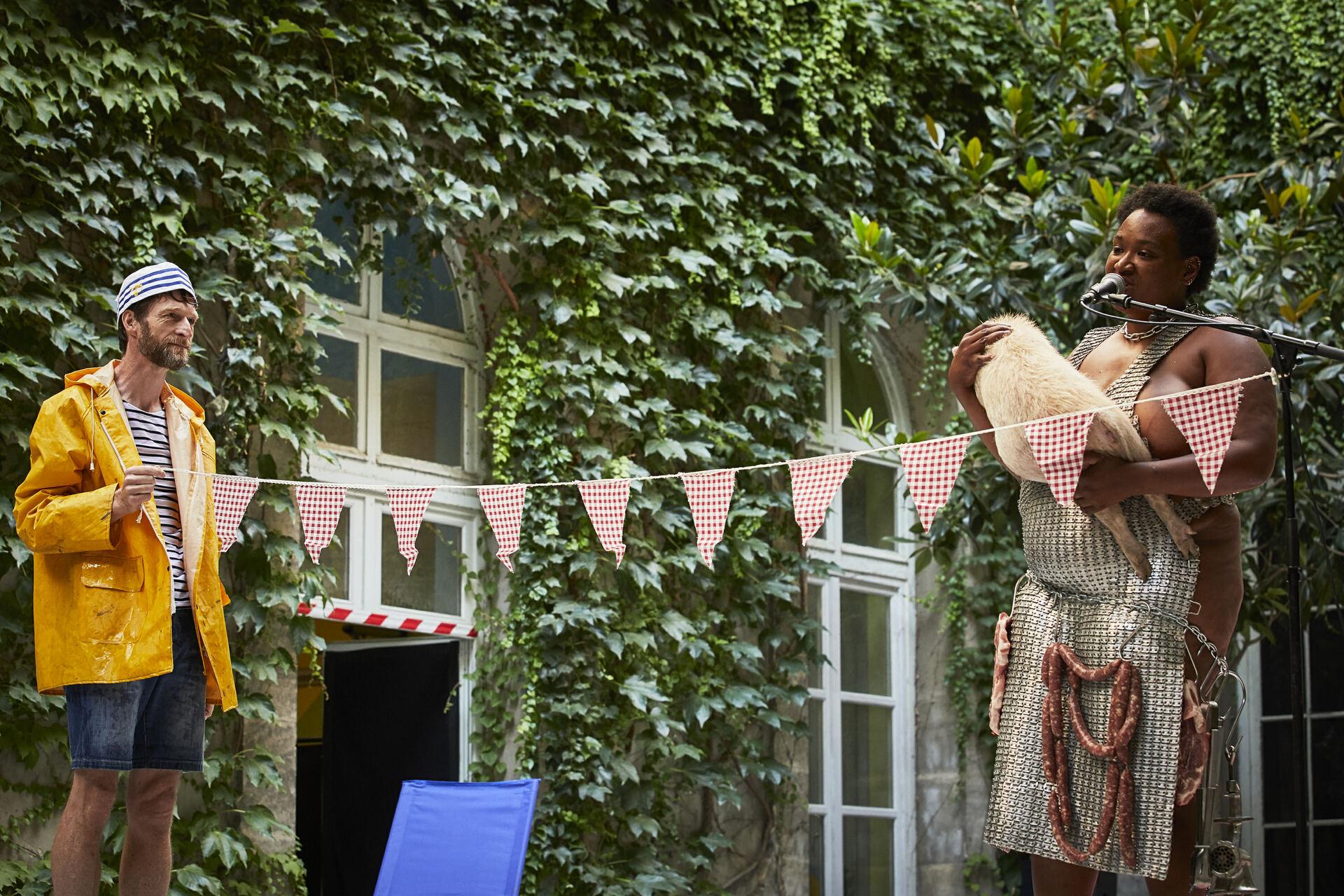 A l’origine de Rébecca, la Picardie. A l’origine de Pierre, la Bretagne. Mais Rébecca devient noire et Pierre devient pédé. Puis Rébecca veut se convertir en bouchère créole tandis que Pierre bannit Dieu de sa vie car il est né débile. Rébecca veut redevenir vierge.Il y a quelque chose de transcendant à jouer dans un lieu chargé de culte. Alors on déplie les couches de nos personnes pour y trouver la foi. Quand l’avons-nous rencontrée, quand nous a-t-elle fuit ? Où sont nos miracles ? Que confessons nous ? Quelle est la genèse de notre monde à nous ? Jouer à être des créatures divines et des personnages profanes.Au sein d’un village de montagne, une bouchère seule reprend la boutique de M. Guillemin.La Bouchère, sainte femme pleine de rage, dépèce et mitonne, prête à bondir. L’Innocent conscient de sa naïveté infirme, hume dans l’air une vérité qu’il ne peut décrire.Les mots ont deux façons de jaillir. Soit en long flots incontrôlés, qui soulagent un trop plein, une impossibilité de dessiner clairement le monde. Soit en couteaux acérés et méthodiques, pesamment calculés pour le faire trembler ce monde.La Bouchère se lie d’amitié avec l’Innocent, il a confiance en elle comme les bergers en l’étoile. Et dans la viande qu’elle produit, dans le sang qui s’écoule de ses bêtes mortes, Il y a du sacré.